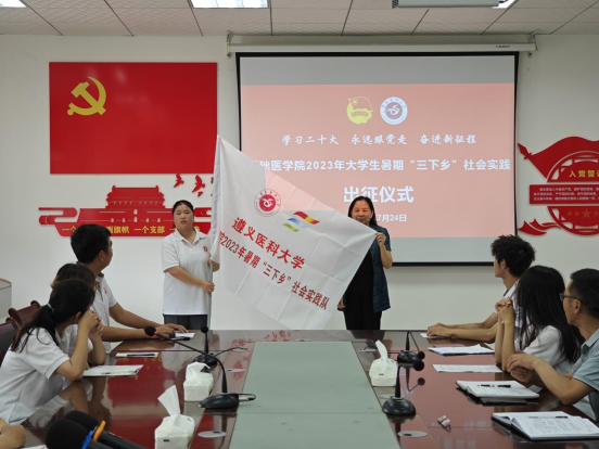 出征仪式。7月24日上午,出征仪式在云顶国际8588yd会议室举行。公司党委书记罗军敏、副书记袁晓锋、团委副书记李爱国、辅导员陈莉及实践队全体队员参加,仪式由李爱国老师主持。罗军敏书记对实践队员提出四点要求:一是认真学习贯彻党的二十大精神,将理论与实践相结合,二是注意安全、遵守纪律、服从管理,三是文明礼貌、展现遵医学子积极向上精神风貌,四是勤学善思、发扬奉献、友爱、互助、进步的志愿者精神;袁晓锋副书记叮嘱实践队员严格遵守统一安排,用心实践,遇到问题及时与指导老师沟通;李爱国老师介绍了此次实践队组队情况以及近几年公司暑期“三下乡”社会实践开展情况;陈莉老师与陈明同学分别代表带队教师与实践队员发言;最后,现场进行了授旗仪式。