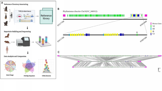 公司姚新生团队基于马铁菊头蝠、苍白矛吻蝠、伏翼的TRB-VDJC胚系基因注释,生成了蝙蝠TRB胚系基因参考数据库,初步构建出用于分析不同种类蝙蝠TCR CDR3组库,建立了初步试用于蝙蝠TRB-VDJC分析的MiXCR分析工具平台。通过杭州艾沐蒽公司完成的中菊头蝠样本制备、5’RACE法进行TCR beta chain CDR3组库的建库、ImmuHub®技术平台二代测序,获取原始的下机数据(数据已在公共平台共享),从VDJ的取用、CDR3区的长度和AA组成、CDR3 motif、CDR3的多样性和克隆性、CDR3区核苷酸的插入和缺失等特征,根据团队多年在人和小鼠TCR CDR3组库研究中的积累,首次对比阐述了蝙蝠TRB CDR3组库的基本特征,为开展蝙蝠T细胞抗病毒、抗肿瘤的特异应答或耐受机制,提供了全新的解决方案。