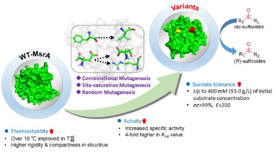 手性亚砜是一类含有亚硫酰基官能团的重要有机化合物。许多临床药物如质子泵抑制剂埃索美拉唑等均含有手性亚砜基团,手性亚砜的高效选择合成备受国内外高度重视。课题组前期研究中,首次将源自假单胞菌的甲硫氨酸亚砜还原酶A(MsrA)成功应用于手性亚砜的动力学拆分制备。但是,和大多数天然酶一样,该酶存在稳定性较差等不足。鉴于此,团队利用定向进化技术,通过随机突变结合定点饱和突变,成功获得了热稳定性提升的酶突变体,其热稳定性较野生型酶蛋白提升了10℃,具有更好的工业应用潜力。更重要的是,该突变体的催化活性也同时得到了提高,打破了酶学领域熟知的“稳定性—活性”权衡理论,具有重要的理论突破。