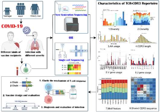 本课题组基于全球多个实验室采用HTS、scTCR-seq开展的COVID-19患者及SARS-CoV-2疫苗接种者的TCR CDR3受体库研究,重点阐述了不同严重程度、不同感染时期的COVID-19患者,以及不同种类SARS-CoV-2疫苗接种者接种前、接种后外周血中应答T细胞的TCR CDR3受体库的详细特征,主要包括多样性、克隆性、V和J基因的取用与配对、CDR3长度、共享CDR3序列或motif等特征和动态变化规律。同时,课题组也已完成100名SARS-CoV-2疫苗志愿接种者,在接种前、第二针接种后、加强针接种后和部分志愿者突破感染后,外周血中RBD-IgG、RBD-IgA、N-IgG、S-IgG的监测,以及TCR-β和BCR-H CDR3受体库动态变化研究。本综述将为SARS-CoV-2感染和疫苗接种后,T细胞应答差异的机制研究,提供对比的数据和新的研究技术方案,为针对SARS-CoV-2突变后的疫苗改进策略和感染者的T细胞免疫治疗等研究提供基础。同时也表明,SARS-CoV-2疫苗或感染对人类免疫系统的短期或长期影响,可以从T细胞应答的“痕迹”进行监测,建立动态比对的适应性免疫应答档案。